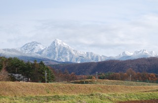 田畑や周りの山々の向こうに見える雪をかぶった八ヶ岳は