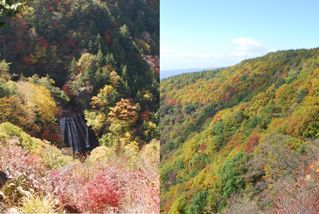 秋の日差しに照らされた王滝や木々・・・・ 。
