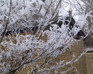 雪と寒さで玄関横の屋根からは 大きな大きなツララ と 太い氷の柱ができました。
